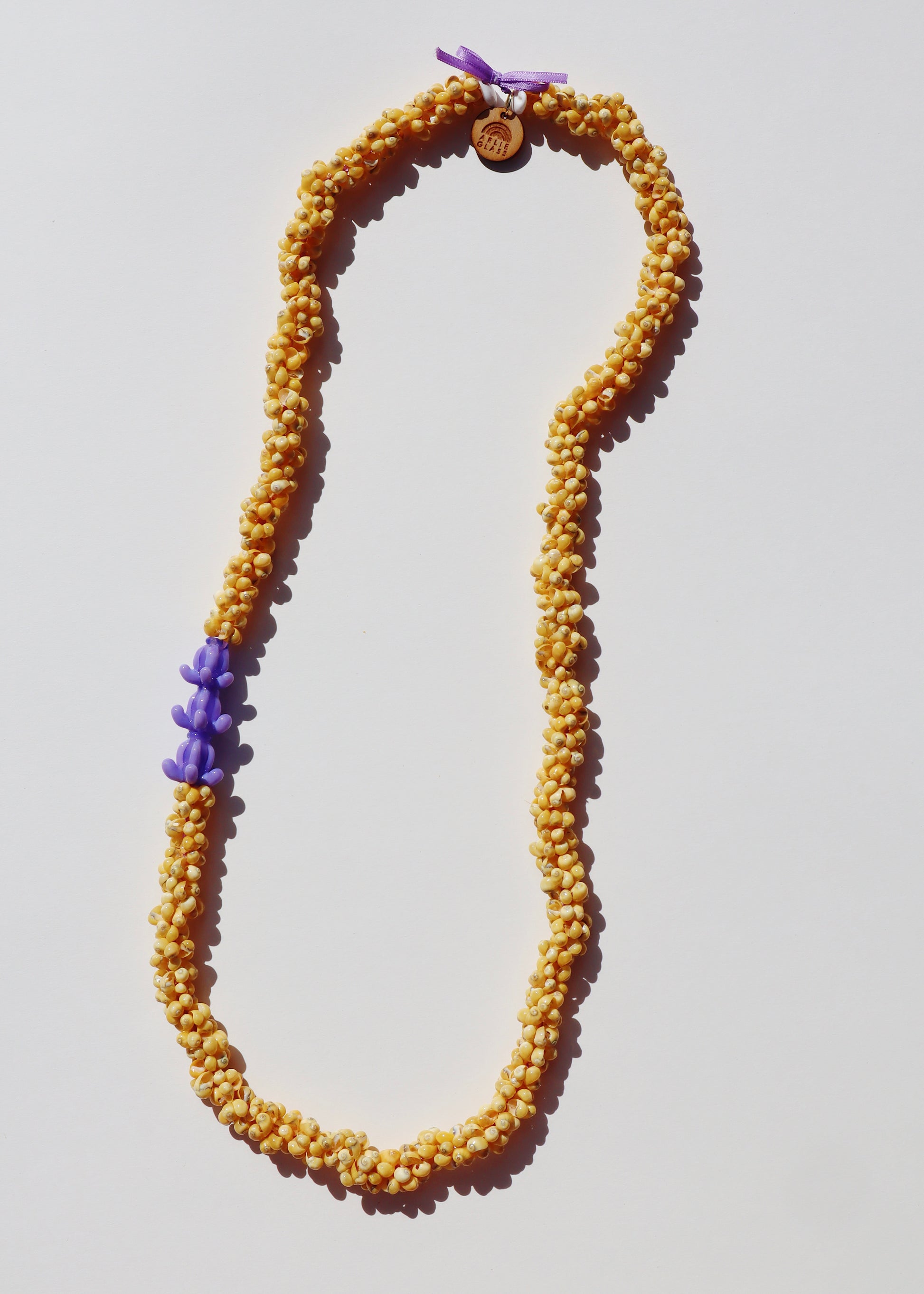 - Glass crown flower paired with mongo shell beads and puka shells on the ends to finish, these lei have a modern look. Wear for a special occasion then hang on the wall as a forever-lei art piece.