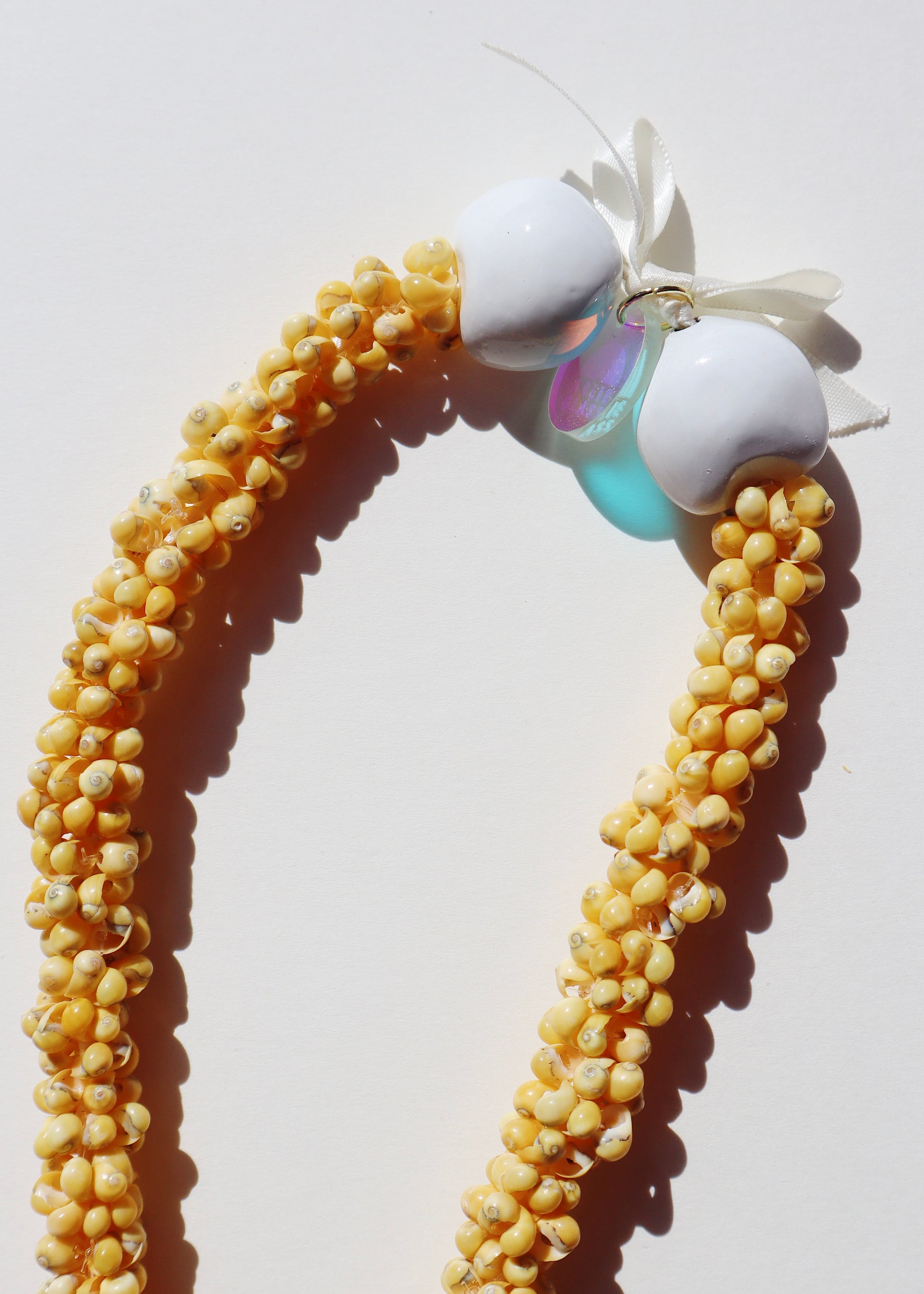 - Glass crown flower paired with mongo shell beads and white painted kukui nuts on the ends to finish, these lei have a modern look. Wear for a special occasion then hang on the wall as a forever-lei art piece.