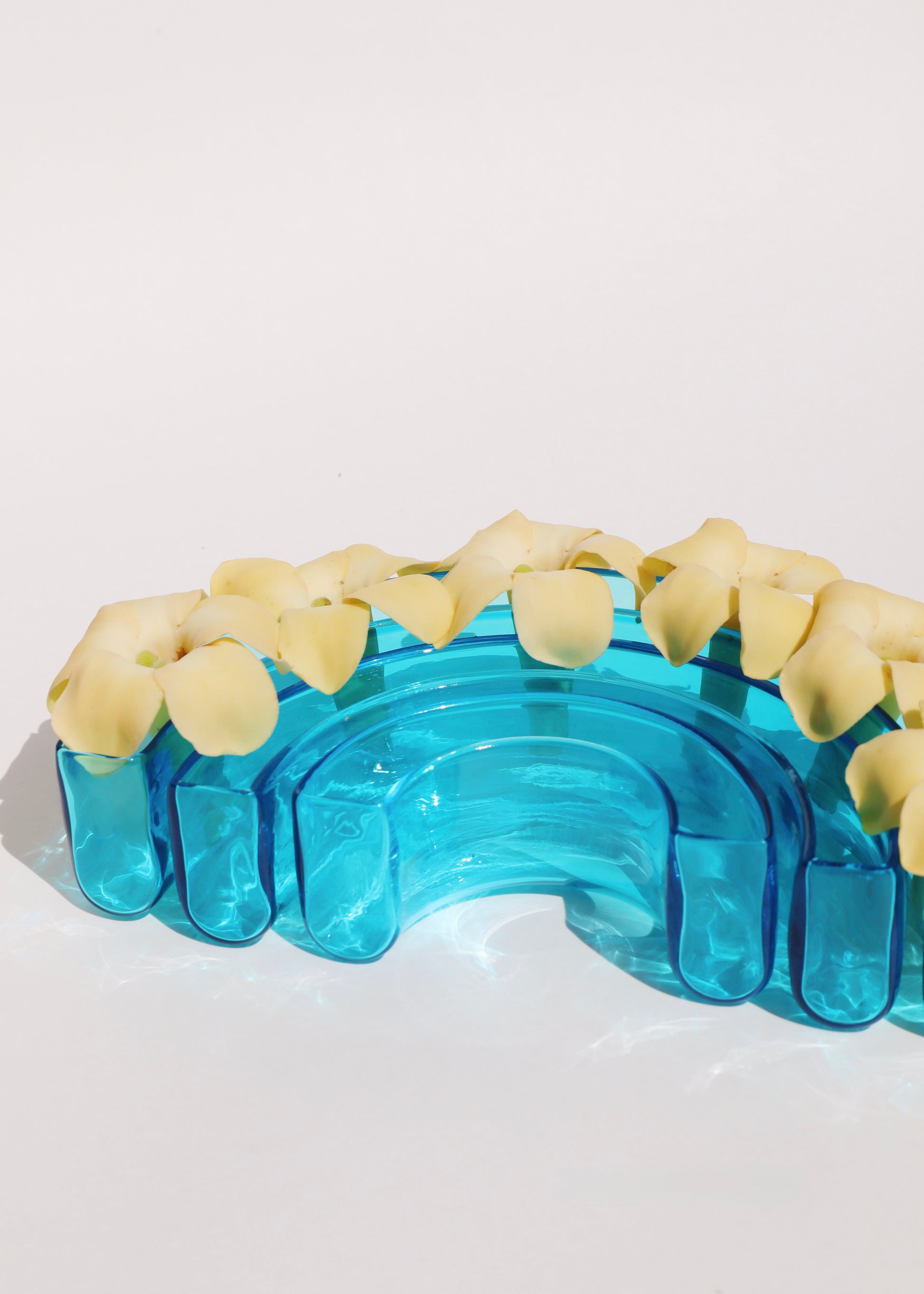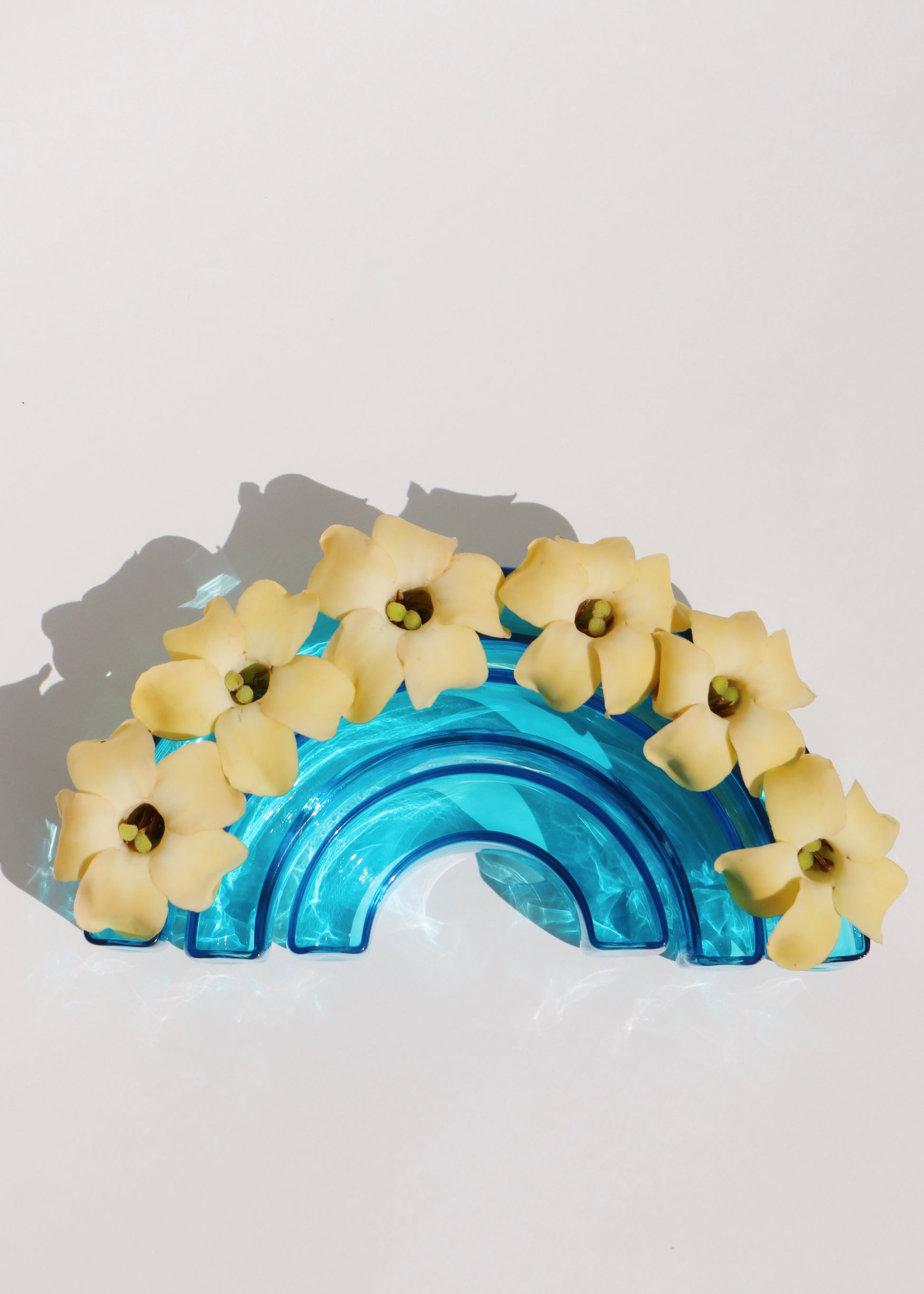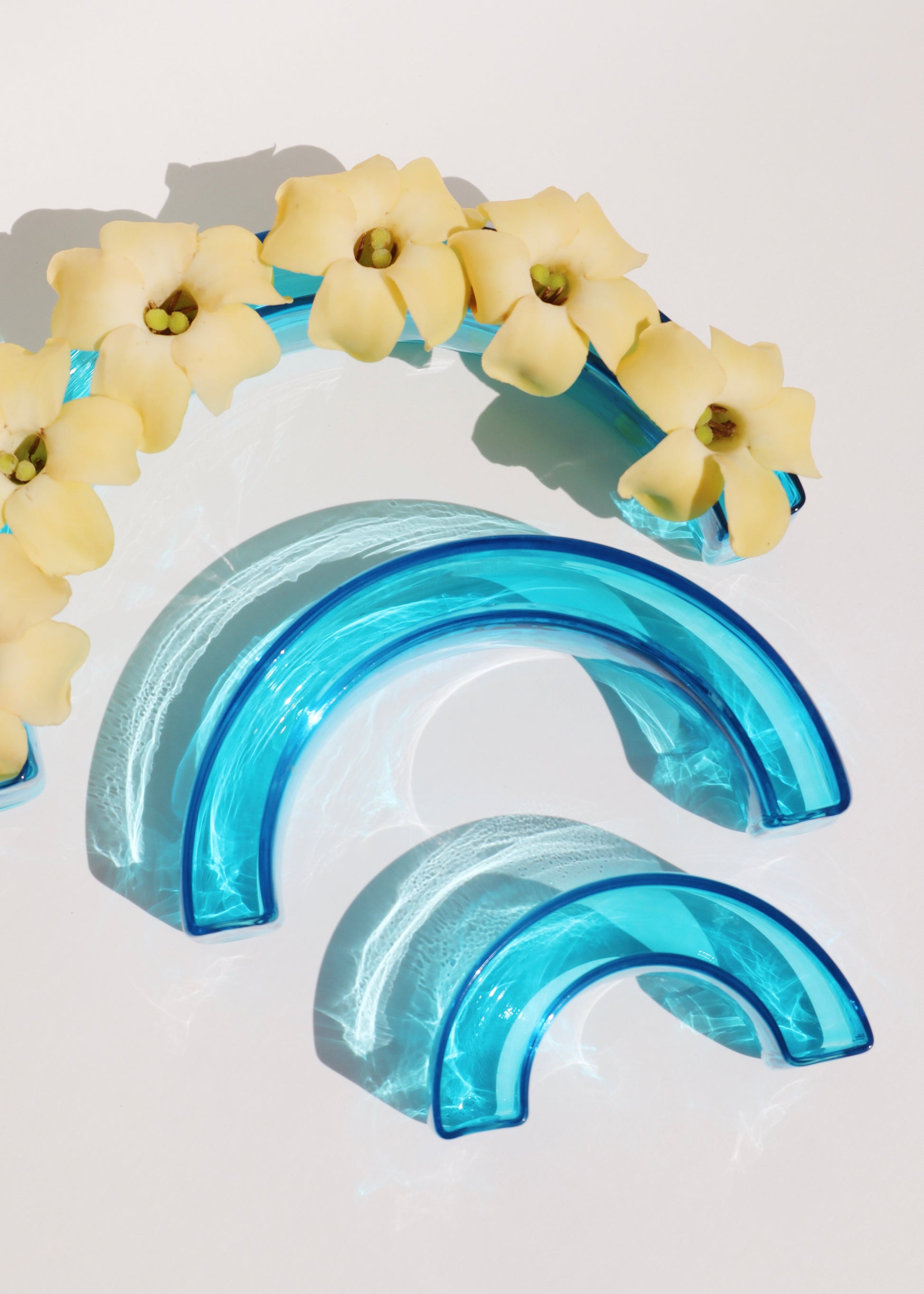 This set of 3 individual blue vases can be used flat to hold water and fresh pua OR stand on the ends to create light catching decor. Each curved vase is separate from the next with a small opening in between for moving around and arranging however you like. So fun to get creative with this set! And a perfect gift for the pua lover in your life. 🌸